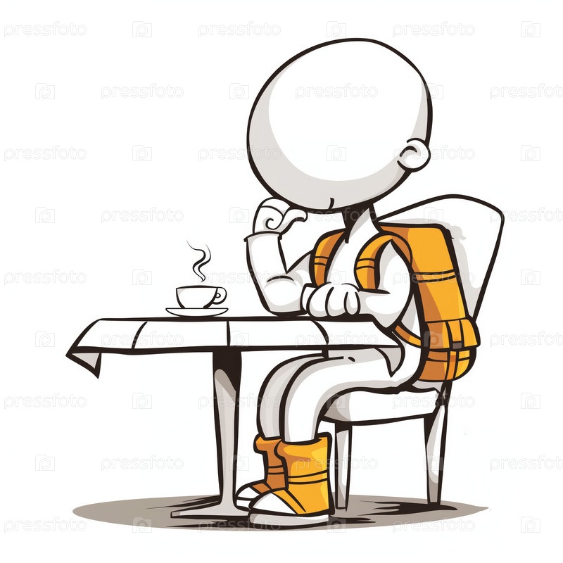 Стикмен сидит за столиком в ресторане, изолированный на белом фоне
