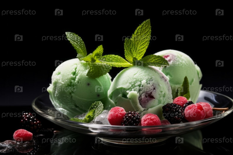 Фисташковое мороженое в стеклянной банке, с сочными ягодами и арбузом, на темном фоне