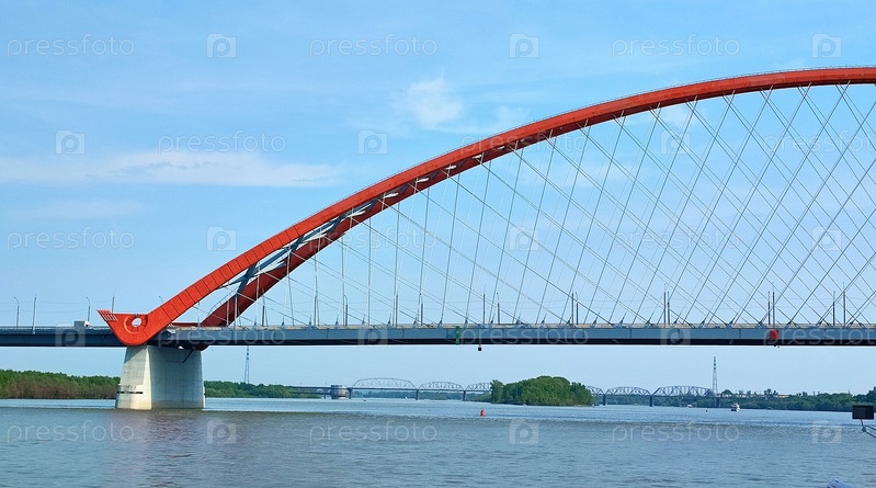 Бугринский мост через реку Обь в городе Новосибирск, лето. Россия. Бугринский мост над рекой Обь в Новосибирске, лето. Россия
