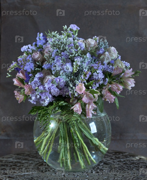 Букет из разных роскошных цветов в стеклянной круглой вазе. Флористический дизайн