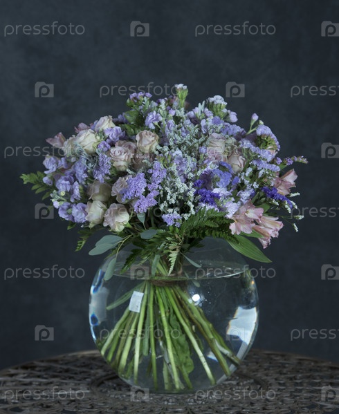 Букет из разных роскошных цветов в стеклянной круглой вазе. Флористический дизайн