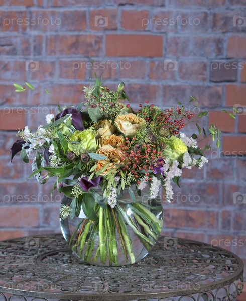 Букет из разных роскошных цветов в стеклянной круглой вазе. Флористический дизайн