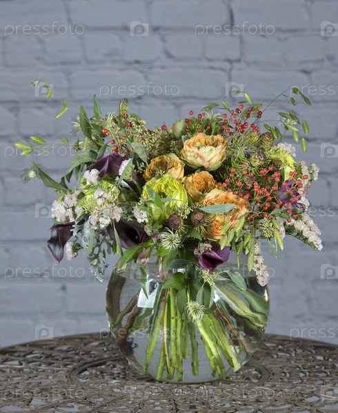 Букет из разных роскошных цветов в стеклянной круглой вазе. Флористический дизайн