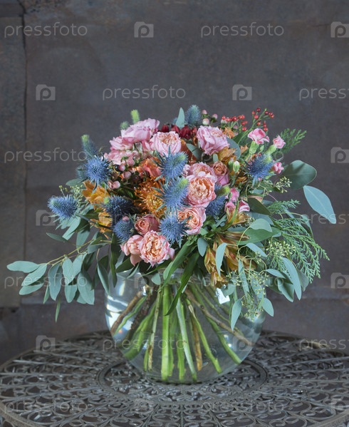 Букет из разных роскошных цветов в стеклянной круглой вазе. Флористический дизайн