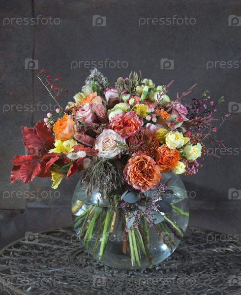 Букет из разных роскошных цветов в стеклянной круглой вазе. Флористический дизайн