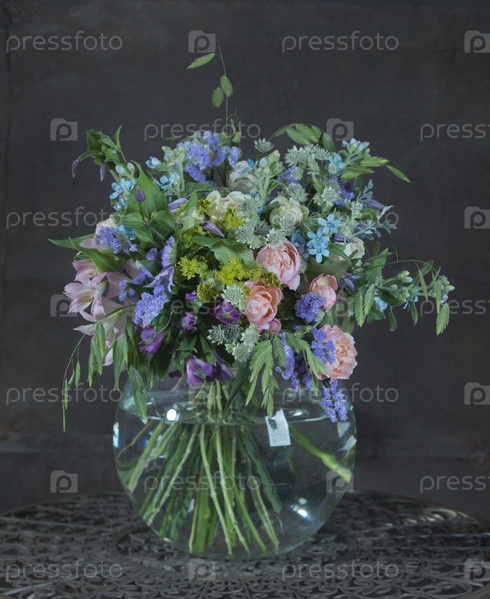 Букет из разных роскошных цветов в стеклянной круглой вазе. Флористический дизайн