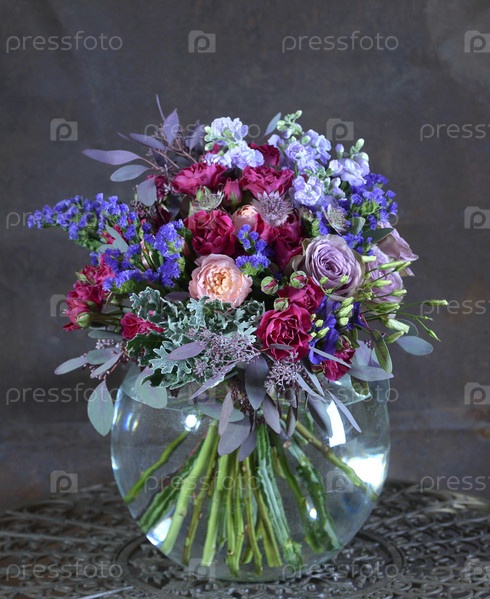 Букет из разных роскошных цветов в стеклянной круглой вазе. Флористический дизайн