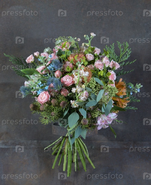 Букет из разных роскошных роз и других цветов. Флористический дизайн