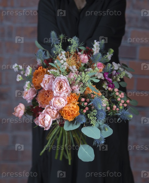 Букет из разных роскошных роз и других цветов. Флористический дизайн