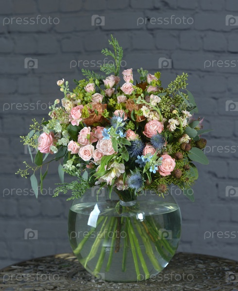 Букет из разных роскошных роз и других цветов. Флористический дизайн
