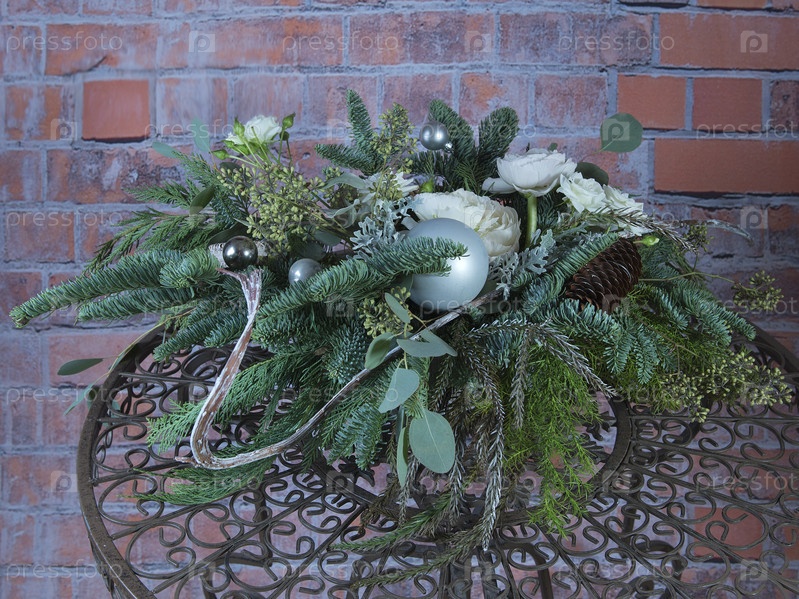 Букет из разных роскошных цветов и хвойных веток. Флористический дизайн