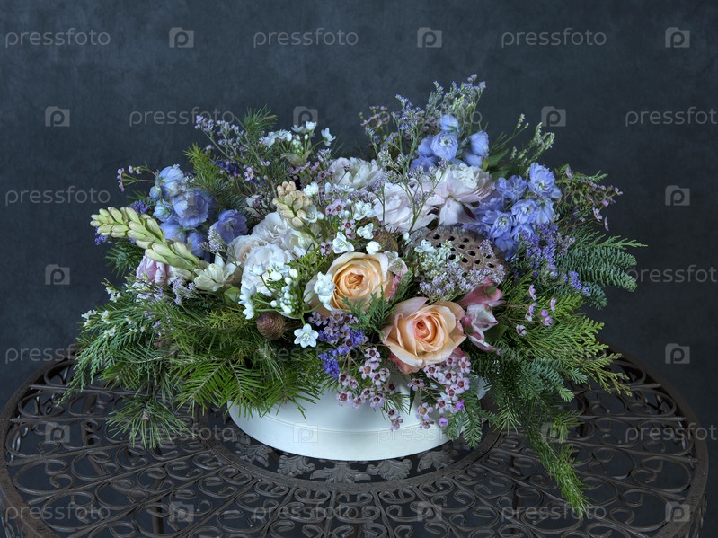 Букет из разных роскошных цветов и хвойных веток. Флористический дизайн