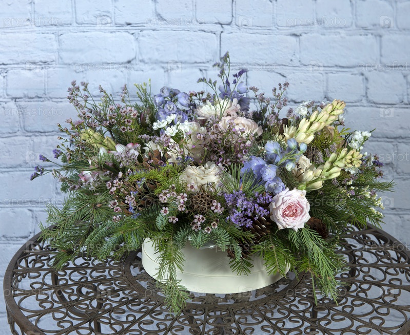 Букет из разных роскошных цветов и хвойных веток. Флористический дизайн