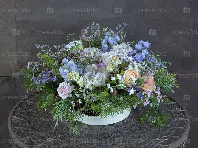 Букет из разных роскошных цветов и хвойных веток. Флористический дизайн