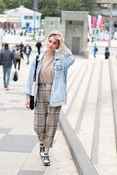 Молодая красивая женщина позирует в синей куртке на улице