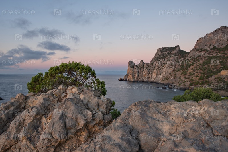 Россия, Новый Свет. Потрясающий рассветный вид с мыса Капчик на окружающую бухту Крымского полуострова