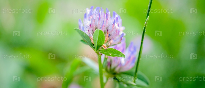Цветущий клевер среди зеленой травы, крупный план размытого фона