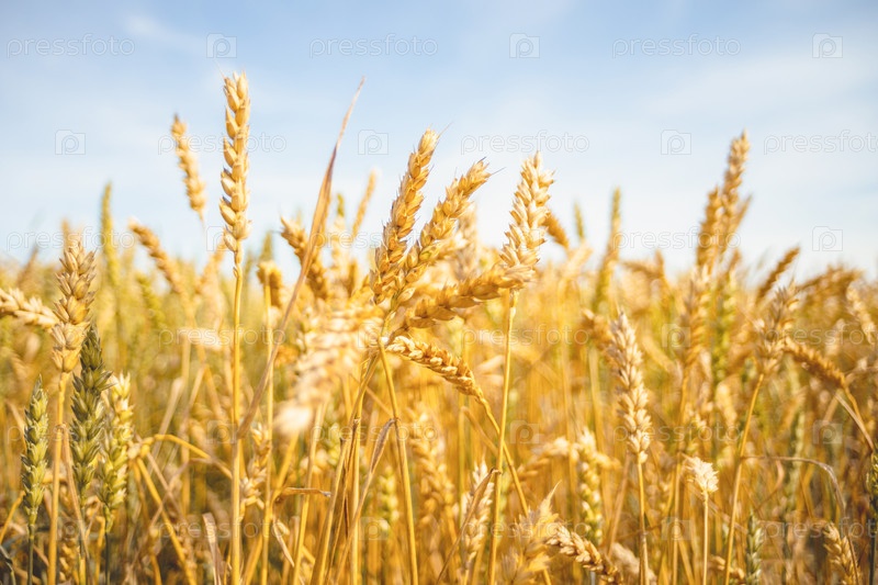 Спелые золотистые колосья пшеницы под голубым небом в солнечный день, крупный план