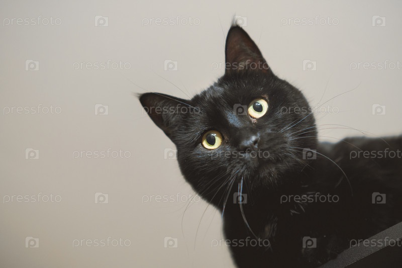 Морда черного красивого молодого кота с желтыми глазами