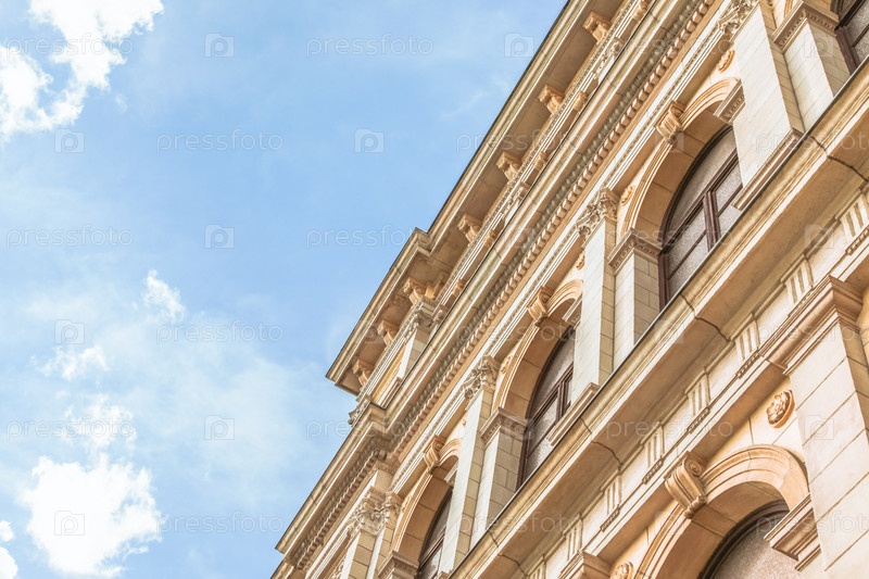 Часть старого архитектурного комплекса, голубое небо, белые облака, фон, вид снизу, тонированный
