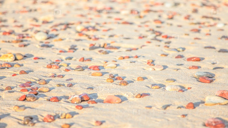 Мелкие камешки на золотистом песке пляжа под солнцем