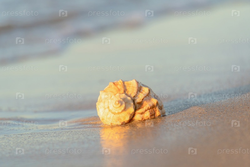 Красивая ракушка лежит на пляже, рядом с лазурной водой моря