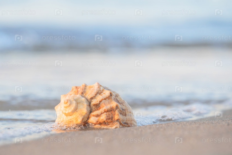 Красивая ракушка лежит на пляже, рядом с лазурной водой моря