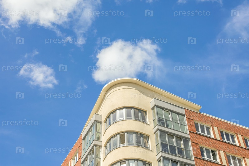 Часть современного многоквартирного дома в солнечный полдень, на фоне голубого неба и белых облаков