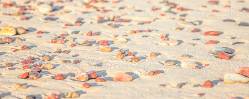 Мелкие камешки на золотистом песке пляжа под солнцем