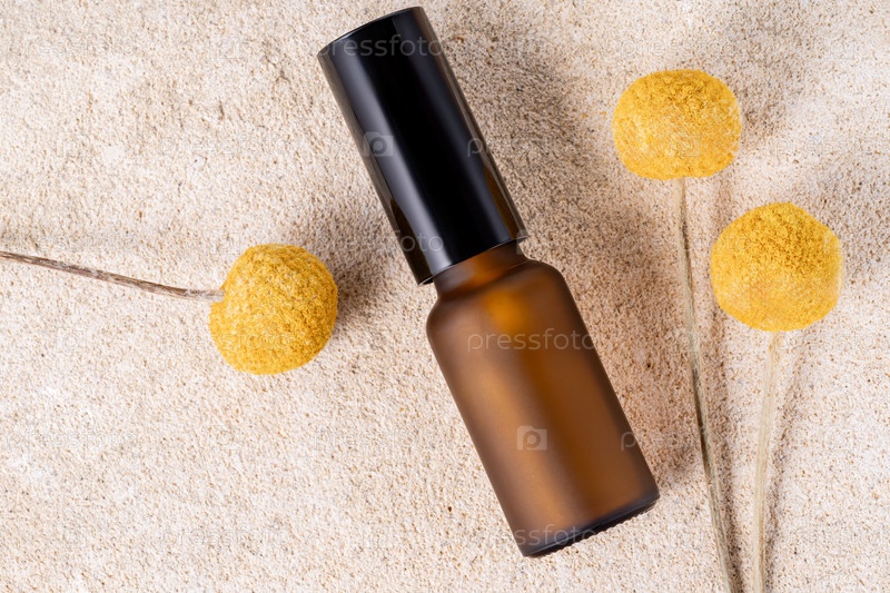 Бутылка из янтарного стекла с открытой крышкой и пустой этикеткой, крем на подставке из натурального камня на бежевом фоне. Макет натуральной органической спа-косметики. Минимальное эстетическое косметическое средство по уходу за кожей