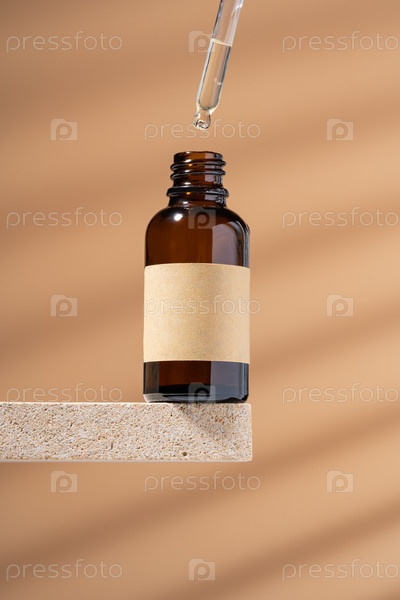 Макет янтарного стеклянного флакона с пустой этикеткой и бамбуковой крышкой-капельницей на постаменте из натурального камня. Сыворотка для лица, эфирное масло для ухода за женской кожей на коричневом фоне, макет