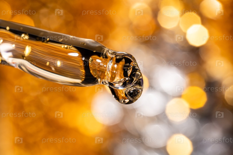 Жидкая сыворотка и пипетка на фоне боке с золотистым фоном, макро. Капля сыворотки из 24-каратного золота выпадает из пипетки