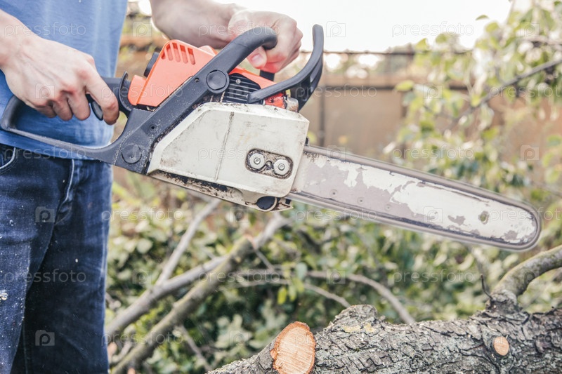 Мужчина с бензопилой пилит дерево, упавшее после урагана