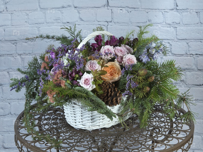 Букет из разных роскошных цветов и хвойных веток. Флористический дизайн