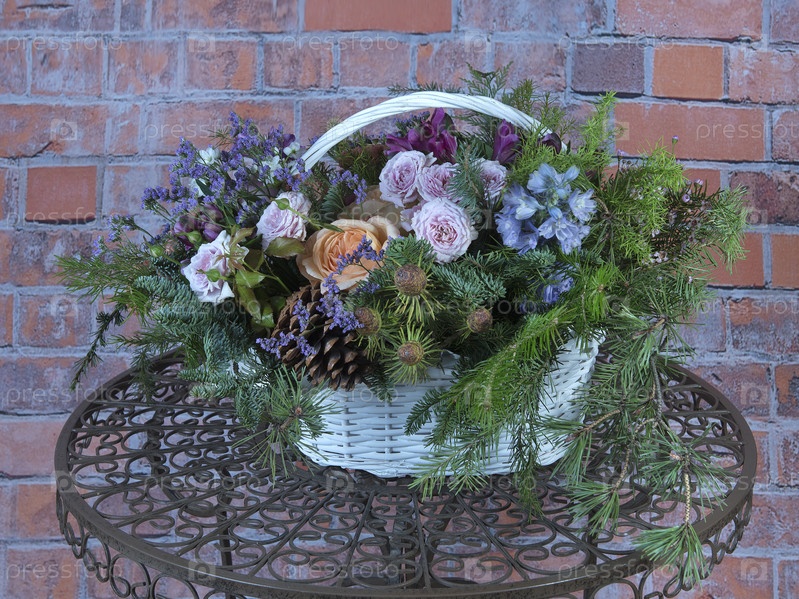 Букет из разных роскошных цветов и хвойных веток. Флористический дизайн