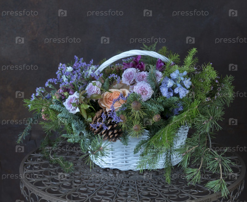 Букет из разных роскошных цветов и хвойных веток. Флористический дизайн
