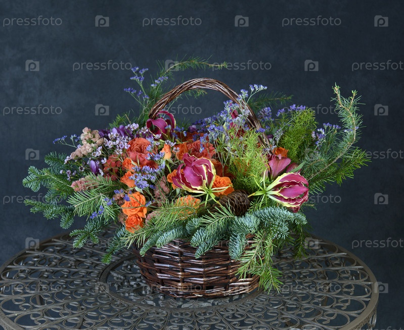 Букет из разных роскошных цветов и хвойных веток. Флористический дизайн