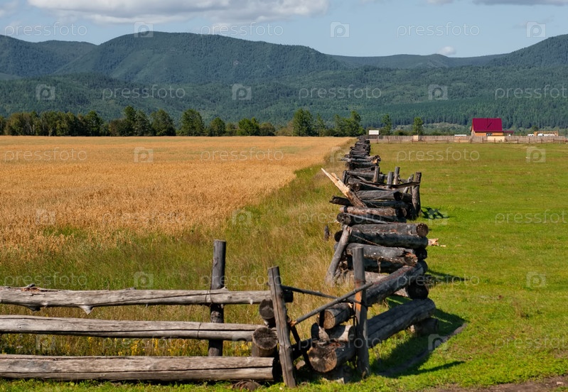 Россия. Республика Бурятия. Вид на поля в долине реки Иркут огороженные деревянными заборами особой зигзагообразной конструкции из бревен
