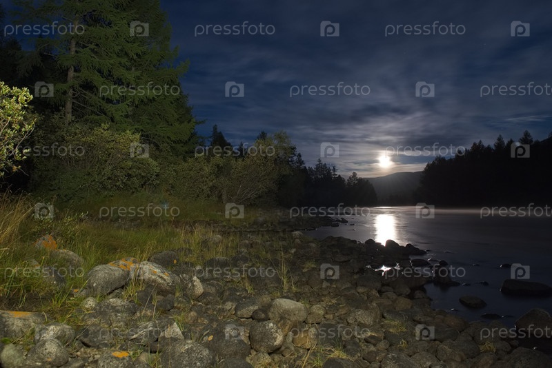 Россия. Западные Саяны. Вид на каменистый берег реки Тисса в окружении гор в полнолунную летнюю ночь
