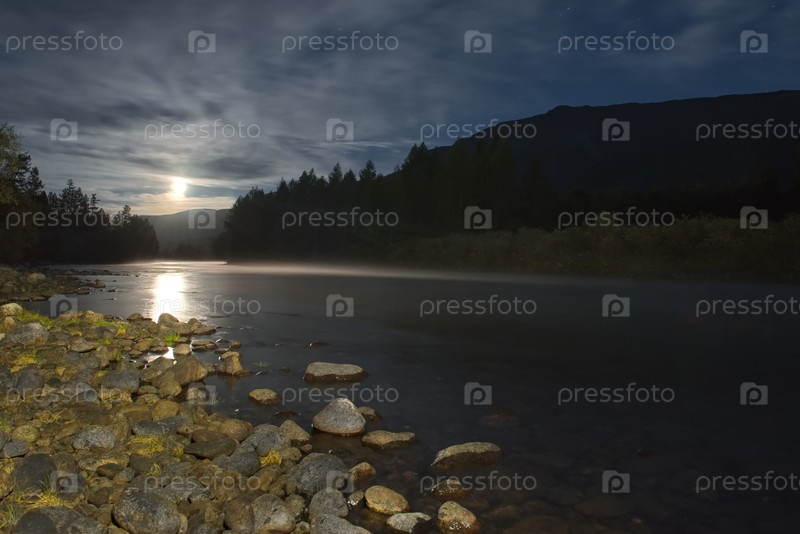 Россия. Западные Саяны. Вид на каменистый берег реки Тисса в окружении гор в полнолунную летнюю ночь