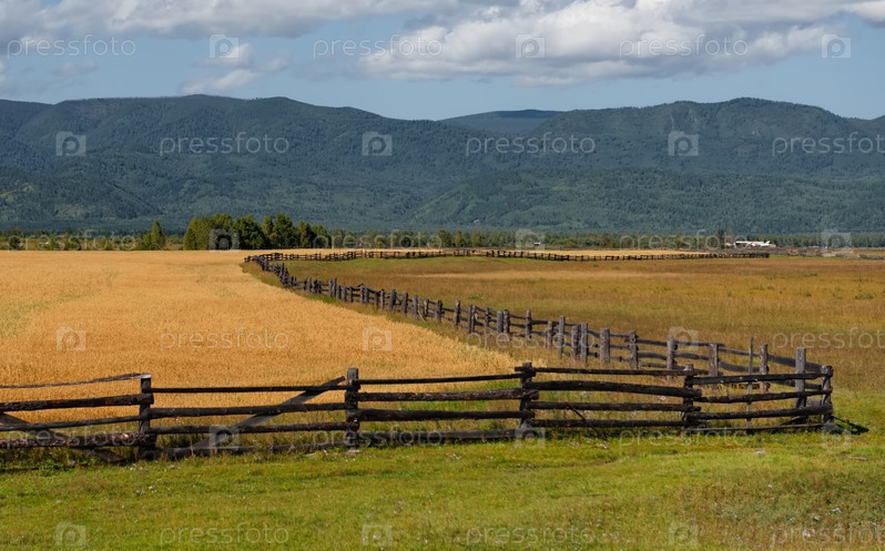 Россия. Республика Бурятия. Вид на поля в долине реки Иркут огороженные деревянными заборами особой зигзагообразной конструкции из бревен