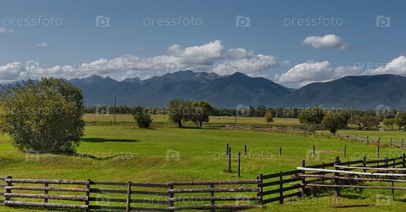 Россия. Республика Бурятия. Вид на поля в долине реки Иркут огороженные деревянными заборами особой зигзагообразной конструкции из бревен