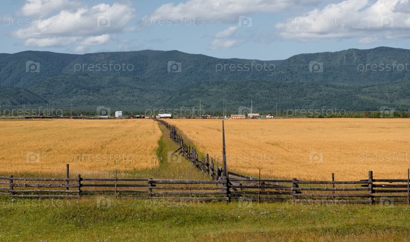 Россия. Республика Бурятия. Вид на поля в долине реки Иркут огороженные деревянными заборами особой зигзагообразной конструкции из бревен