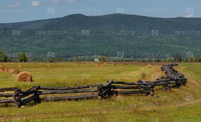 Россия. Республика Бурятия. Вид на поля в долине реки Иркут огороженные деревянными заборами особой зигзагообразной конструкции из бревен