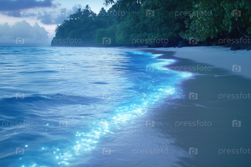 Светящийся прибой на тропическом пляже перед рассветом