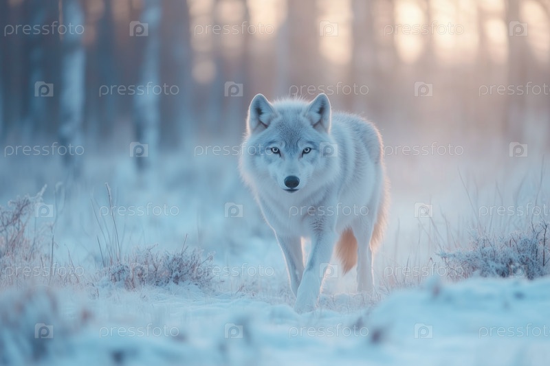 Белый волк бежит в зимнем лесу. Красивый зимний пейзаж с волком