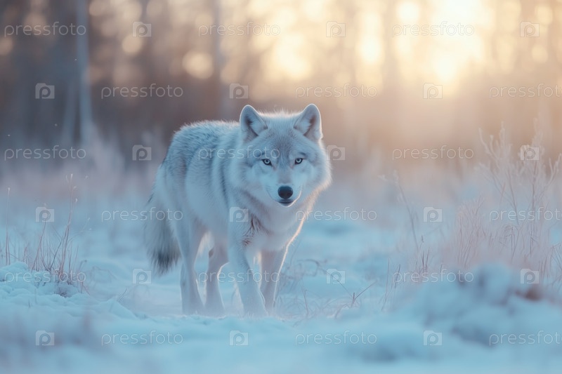 Белый волк в зимнем лесу на закате
