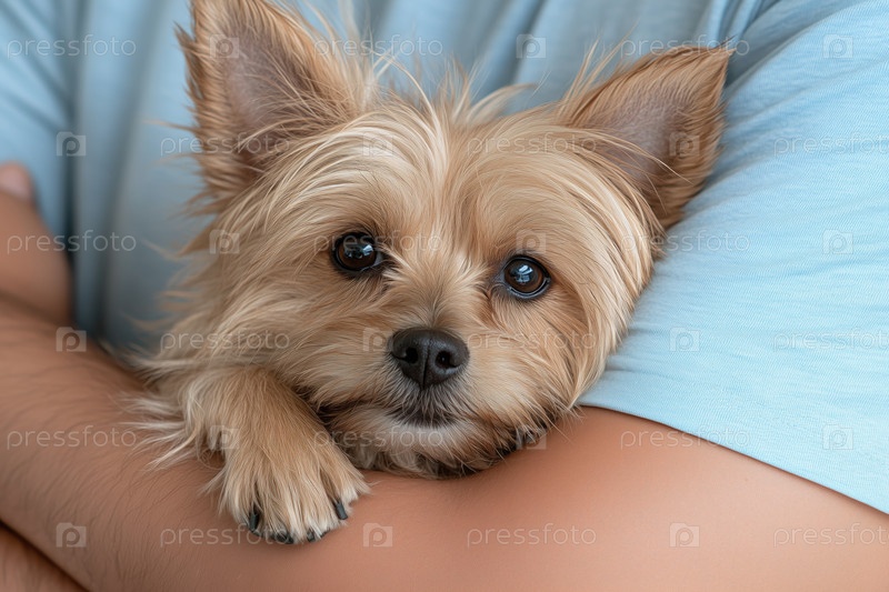 Милая собака породы йоркширский терьер в объятиях мужчины. Концепция ухода за домашними животными