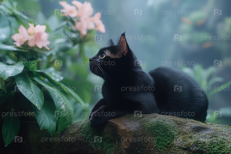 Черный кот сидит на камне в саду на фоне цветов