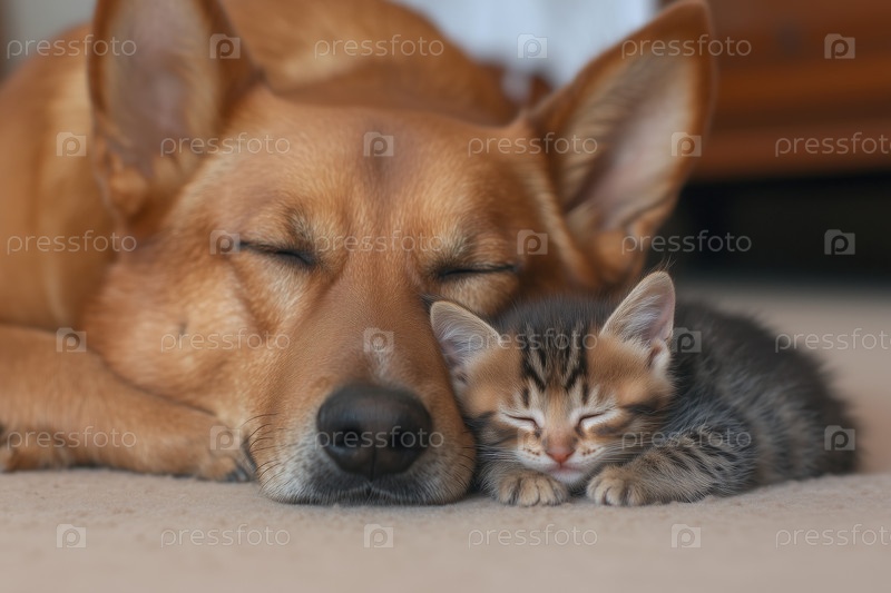 Котенок и собака спят вместе на полу